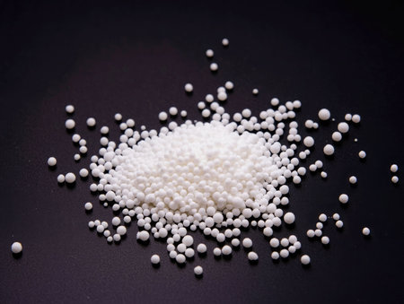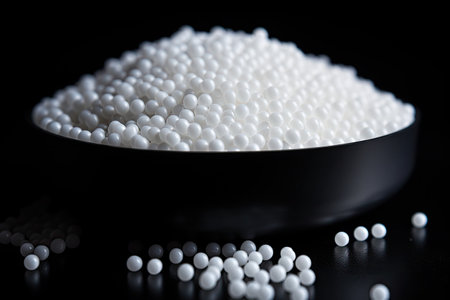 White plastic beads on black background made from polymer resin, petrochemical plant product.