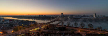 Panorama of Bratislava with Danube river during sunrise with fog over river.
