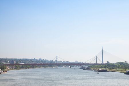BELGRADE, SERBIA - JULY 19, 2018: View of Sava river bank in Belgrade with Brankov Most bridge on the right and the waterfront district of Savamala in background. Picture of Sava river in Belgrade, capital city of Serbia, with Brankov most bridge crossing
