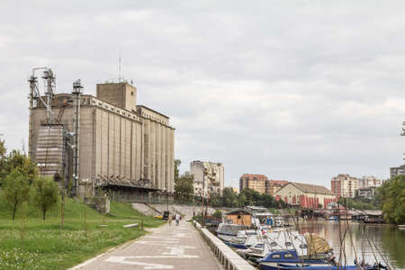 PANCEVO, SERBIA - SEPTEMBER 17, 2016: Panorama of the Tamis river, on Pancevo Waterfront in the center of the city, during a cloudy afternoon. Iconic silos are visible in background. Pancevo is one of Banat biggest cities. Picture of the city center of Pa