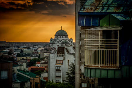 Panoramic view of Belgrade sunset with Temple of Saint Sava