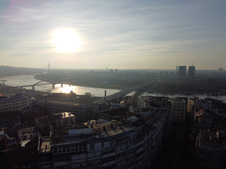 Sun going behind the building and view of the river Sava and urban scape of Belgrade city
