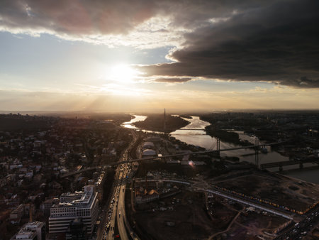 Aerial drone view of a road junction at sunset Belgrade, Serbia, Europe.