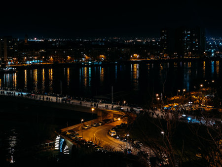 Panoramic view of Danube river at night, Belgrade, Serbia