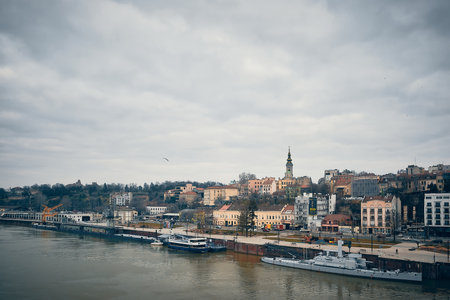 Panoramic view of Sava river embankment with moored ships and vessels and Saint Michael's Cathedral, Belgrade, Serbia