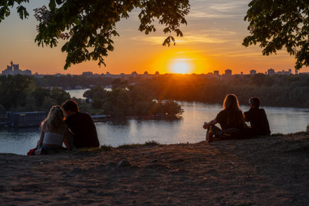 A stunning sunset overlooking the Sava River from Kalamegdan fortress in Belgrade, Serbia. Visitors relax along the riverbank, enjoying the tranquil evening.