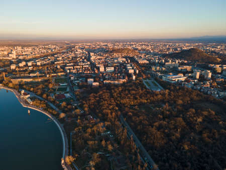 Aerial sunset view of Rowing Venue in city of Plovdiv, Bulgaria