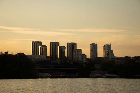 Cityscape on the banks of the Dnieper River, skyscrapers on the banks of the river in Ukraine
