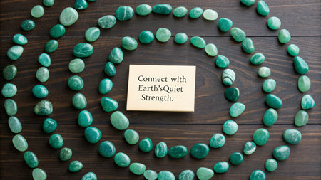Emerald-green gemstones spiraling around a central message rest upon a rustic wooden table, representing inner peace and a mindful approach to wellness.