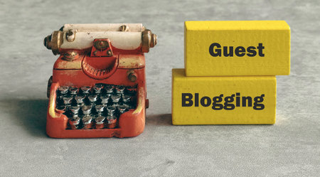 Guest Blogging Text on Yellow Wooden Blocks Next to Vintage Miniature Typewriter