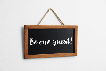 Small blackboard with phrase Be Our Guest hanging on white wall