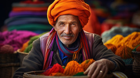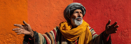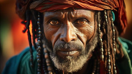 Portrait of a senior man adorned in a vibrant turban and ethnic attire, exuding cultural richness.