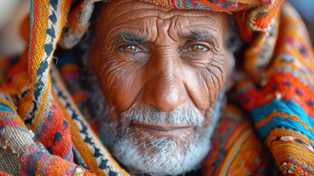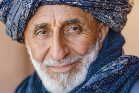 Elderly man with white beard and warm smile wears intricately patterned, blue headscarf and shawl. His deeply lined face exudes wisdom and kindness, emphasizing cultural attire details
