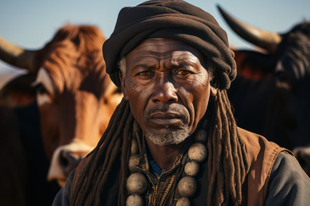 Portrait of people living in Africa, Namibia, dry desert, cows, tribal living, made with Generative AI