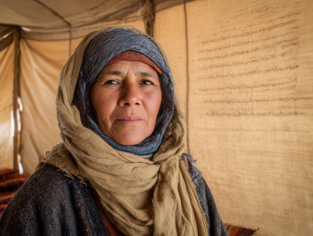 A woman stands inside a tent made of fabric. She wears a headscarf and traditional clothing. The sunlight comes through the fabric, highlighting her face. The surroundings are simple.
