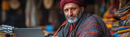 Man in traditional attire, working on a laptop in a colorful marketplace