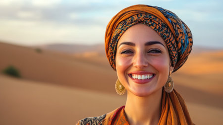 Smiling Woman in a Colorful Turban Standing in the Desert
