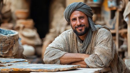 Craftsman smiles while working among handmade pottery surrounded by tools and clay in a rustic workshop capturing a moment of creativity.