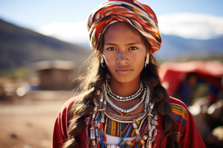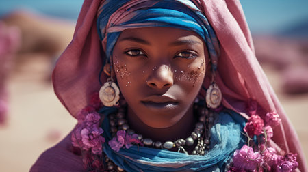 A woman with colorful headdress and earrings looking at the camera, AI