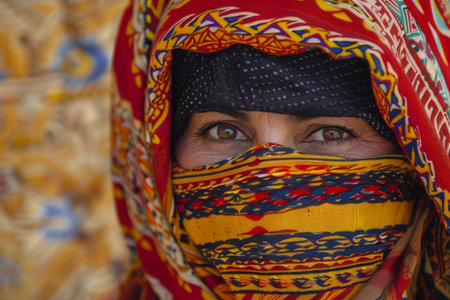Woman wearing a colorful traditional niqab is looking at the camera