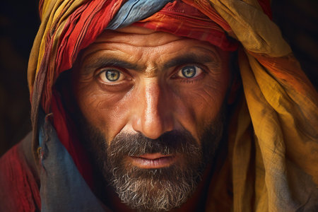 Intense portrait of a man with piercing blue eyes wrapped in a traditional headscarf.