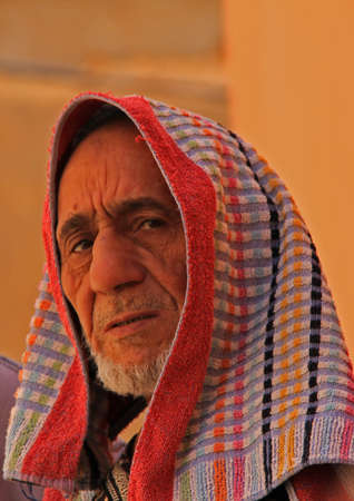 Close-up portrait of Bedouin in desert, local resident. Close portrait.