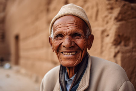 An elderly man from Afghanistan showcases his weathered face, reflecting years of wisdom and resilience against a modest backdrop of nature, embodying the rich culture of his homeland. Generative AI.