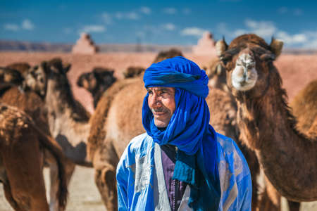 Berber dressed in traditional clothes and turban. Owner of camels at the camel market in Guelmim. Guelmim, Morocco - April 16 2016.