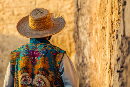 Mature hispanic male musician performing outdoors in traditional attire