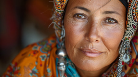 A detailed close-up of arab woman with striking blue eyes and patterned scarf