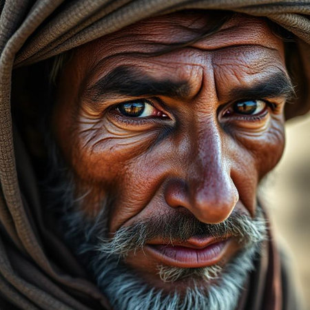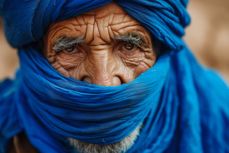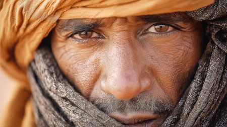 A striking, intimate close-up portrait of a man whose face is partially covered by traditional desert headwear. The focus is on his intense, wise eyes, conveying a sense of resilience and deep character.