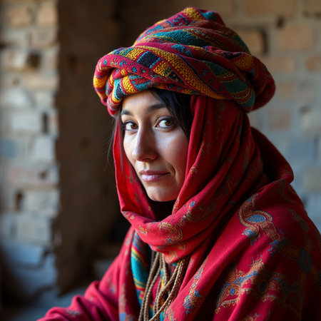 A mature Tajik woman 75 years old, gazes directly showcasing intricate traditional attire, rich cultural heritage of her nationality, evoking wisdom and grace. Brunette woman, wearing a headscarf. AI