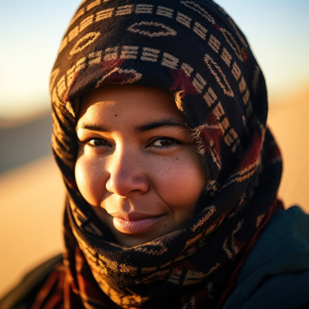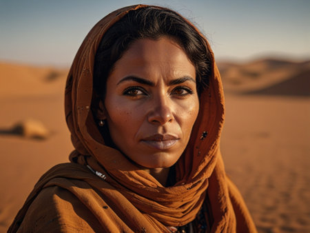 A woman with deep, thoughtful eyes is seen in a desert setting. Her scarf wraps around her head, creating an intriguing contrast with the warm light of sunset, highlighting her features beautifully.