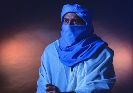 Berber man in night light wearing blue turban with white robe. Leaning on cane. Studio shot.