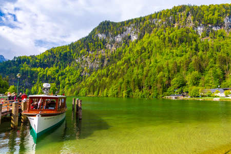 Electric tourist boats on beautiful lake Konigssee pier Berchtesgaden National Park Bavaria Germany