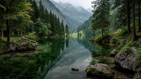 A tranquil scenery of a lake in smog in Berchtesgaden National Park in germany