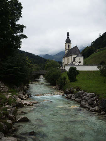 Idyllic rural alpine mountain chapel parish church St Sebastian at Ramsauer Ache river stream in Ramsau Berchtesgaden Upper Bavaria Germany Europe