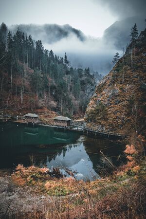 Scenic view of Hintersee lake at autumn morning. Pine trees on stones reflected in the water. The fog spreads over the water. Magic painterly scene in Berchtesgaden Alps, Germany