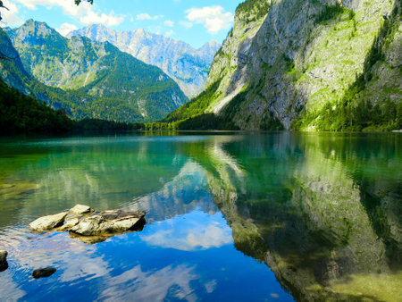 Gorgeous Obersee lake (nearby Konigsee) with water mirror in Bavaria, Germany