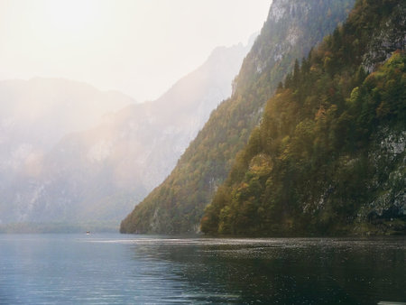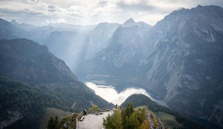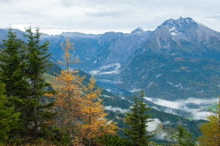 Autumn Alps mountain misty morning view from Jenner Viewing Platform, Schonau am Konigssee, Berchtesgaden national park, Bavaria, Germany. Picturesque traveling, seasonal and nature beauty scene.