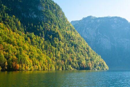 Idyllic Autumn Scenery at the lovely sea of kings in Berchtesgaden, Germany. Lovely colorful trees in Bavaria