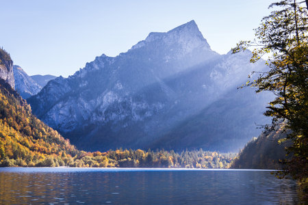 Sunny Autumn Landscape. Mountain Lake with Colorful Leafes under sunlight. Gosausee Lake. Vorderer.