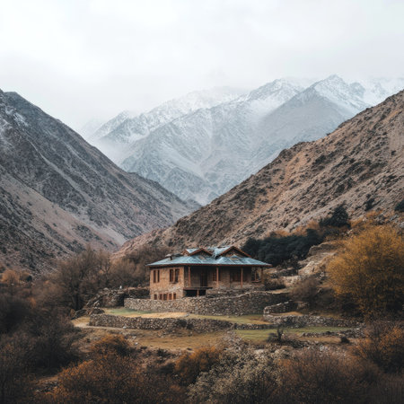 A remote house in a South Asian mountain valley, with the mountains towering above and soft light creating a peaceful atmosphere.