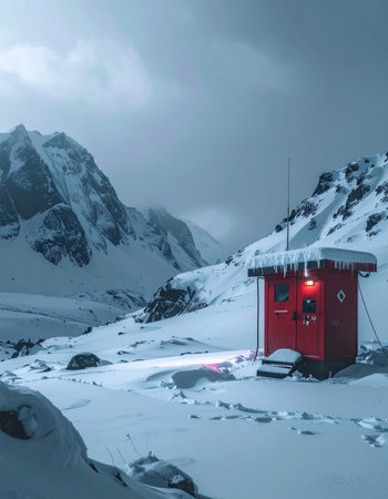 A striking red research facility is nestled among large rocks and snow in a remote, icy landscape. The clear sky enhances the stark contrasts of the cold environment and the buildings color.