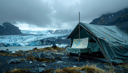 A lone expedition tent stands as a beacon of human resilience against the vast, dramatic backdrop of a receding glacier.