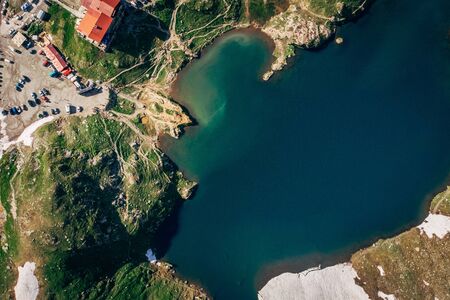 Transfagarasan Road, Romania - July 2016: Balea chalet and Balea Glacier Lake in Sibiu County