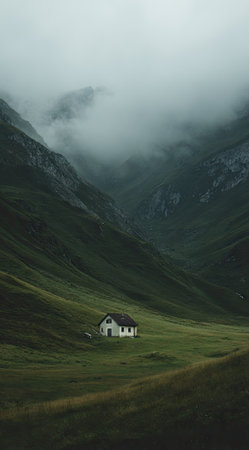 Isolated wooden house perched on a hillside, surrounded by dramatic clouds and mountains, offering a serene escape into nature and tranquility in the wild.
