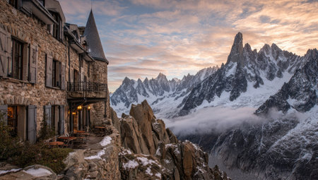 A historic stone building with a pointed roof sits atop a rocky cliff. Towering mountains, covered in snow and ice, fill the background, bathed in the warm light of a sunset. The composition emphasizes depth, with a blend of natural and architectural elements suitable for travel or landscape-themed content.