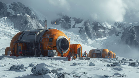 A modern Antarctic station in the mountains. Antarctic Research Station.