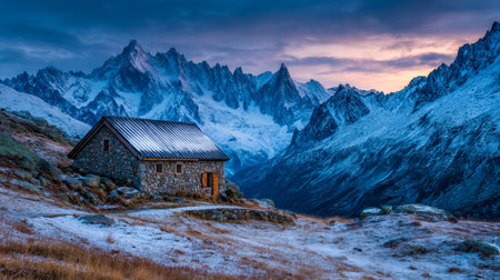 A cozy wooden cabin sits amid pristine snow, with jagged mountain summits glowing orange as the sun dips behind towering alpine slopes.